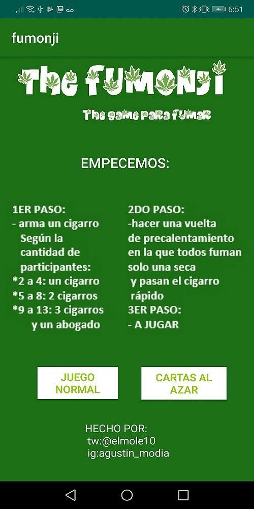吸烟游戏的the fumonji是一款玩得开心的游戏,当您吸烟时是一种具有2种形式的游戏的游戏:普通游戏的形式显示您订购的卡片,而无需重复自己,然后有第二个游戏模式,即该应用程序会随机给您带来的字母,使您感到惊讶,这就是吸烟的全部吸烟